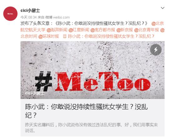 1月1日,女博士罗茜茜在12年之后,通过微信公众号发文,实名举报北京航空航天大学教授陈小武性骚扰女学生。当天,陈小武在接受北京青年报采访时回应称,其没有做过违法乱纪的事。