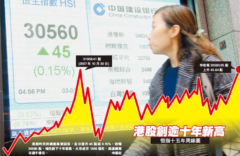 【香港商報网訊】記者吳天淇報道:港股昨天持續冲高后回落,大市波動加劇,高低波幅近300點,全日僅升45點或0.15%,收報30560點,惟仍創下十年新高,大市成交1308億元,為連續兩日過千億元。市場觀望美國聯儲局將公布12月會議記錄,會否暗示貨幣政策的未來走向。