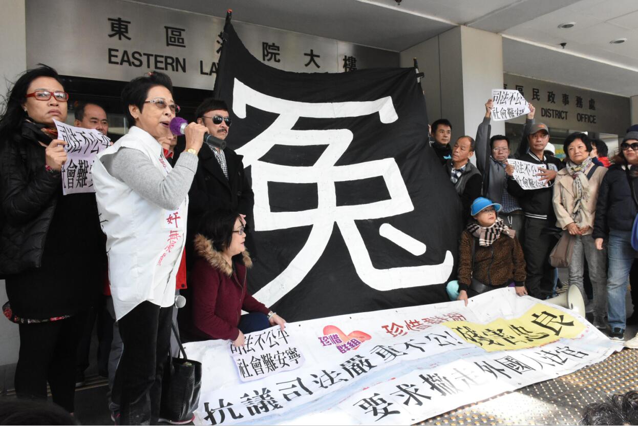 有团体在法庭外举起巨型“冤”字横额,为朱经纬喊冤。记者冯瀚文摄