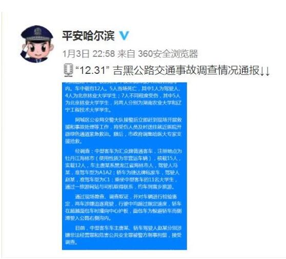 1月3日夜间,@平安哈尔滨 发布通报:2017年12月31日7时14分许,一辆中型客车行驶至吉黑公路333公里处时发生事故,该车为躲避前方撞到高速路中心护板的轿车,发生侧滑驶入公路右侧沟内。车中载有12人。5人当场死亡,其中1人为驾驶人、4人为北京林业大学学生;7人不同程度受伤,其中5人为北京林业大学学生,另两人分别为湖南农业大学和辽宁工程技术大学学生。