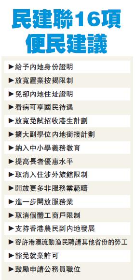 在當天會見中,民建聯就這16項具體建議與廣東省進行交流。李慧琼介紹,在便利生活方面,民建聯希望廣東能放寬有關規定,給予不在廣東定居的港人發放內地身份證明;放寬港人在廣東置業按揭限制;放寬香港人在廣東辦理商務及公共服務時的內地住址證明需要;研究以適當方式,讓居於廣東省內的香港人可以享受內地居民收費水平的公立醫院基本醫療服務;擴大香港副學位學生出路,讓他們能夠方便就讀廣東省內高等院校的第三年本科教育;為在內地養老的香港長者提供與內地長者一樣的公共交通等優惠;取消香港人在內地入住涉外旅館的限制等。