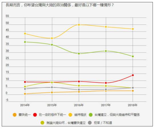 同时,蔡英文上台后,主张统一的人持续上升。