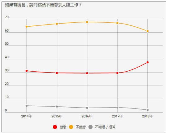 调查显示,当被问到来大陆工作的意愿时,有37.5%回答愿意,为2010年以来的新高点,交叉分析后发现20到29岁这最高,达到43.8%;30到39岁者也有42.7%。随着越来越多的学生来到大陆交流学习,甚至发现可以找到工作,态度就慢慢发生了转变。