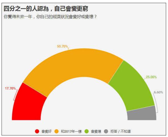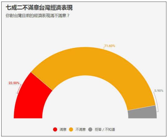 而对于台湾目前的经济表现,不满意者远大于满意者,尽管满意者有微幅上升迹象。有71.6%的民众对台湾经济表现不满意。四分之一的人认为自己会变穷。有59.26%的民众对台湾未来持悲观态度,乐观者只有33.33%。
