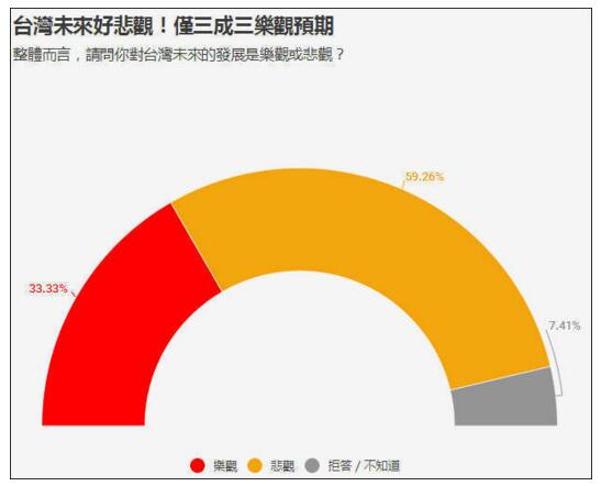 调查显示,台湾民众对台湾前景悲观大于乐观。回顾过去几年,在2017年蔡英文上台后的首次调查,对台湾前景感到乐观这从前一年的32.8%爬升到39.1%,但2018年又降回到33.3%。