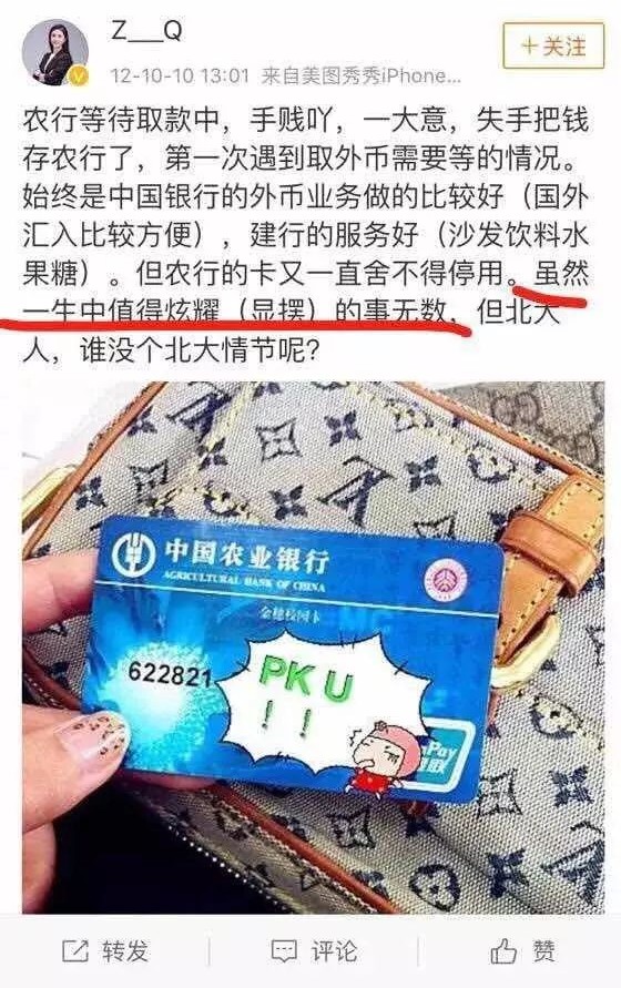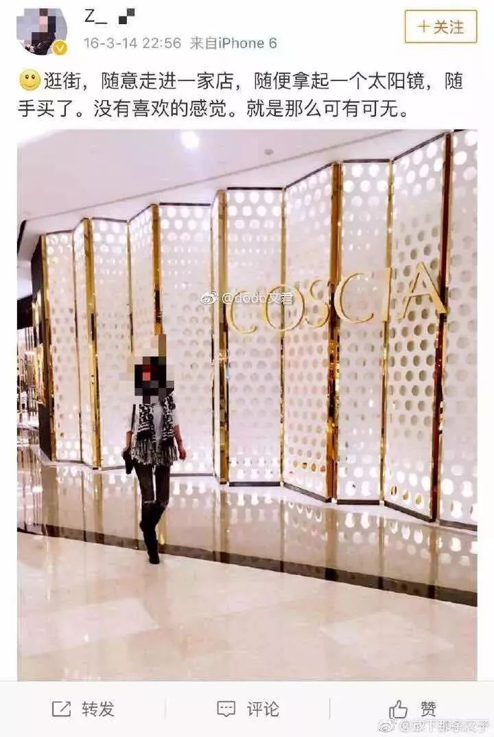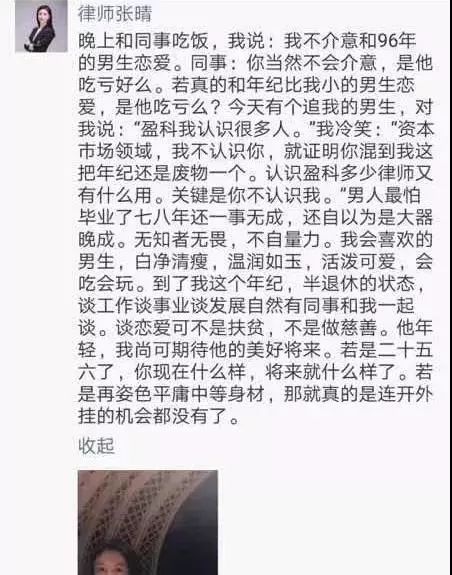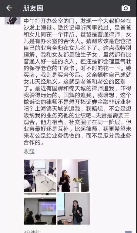 她在自己朋友圈及微博内发表的一系列“炫富”言论被网友曝光。“我实在不想我将来的小孩的爸爸出生于县城”、“杀马特乡村非主流的时候只知道买LV”、“一单业务几百万律师费还是很累的,开票最多只能开一百万一张”……