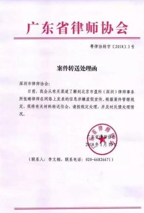 据@北京青年报消息,1月10日,广东省律师协会向深圳市律师协会发送了一份案件转送处理函,表示从相关渠道了解到张晴律师在网上发表的信息涉嫌虚假宣传,根据案件管辖规定,请深圳市律师协会按照规定处理,并及时反馈处理情况。
