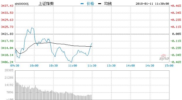 【香港商報網訊】據新浪財經,1月11日消息,早盤兩市低開,滬指在區塊鏈、稀有金屬等板塊的帶動下快速拉升翻紅,短暫橫盤震蕩後,陷入回調態勢,創業板開盤相對低迷,但在題材股的帶動下逐漸走高翻紅,截止午盤,滬指報3416.65,跌0.15%;深指報11413.88,跌0.20%;創指報1791.71,漲0.04%。