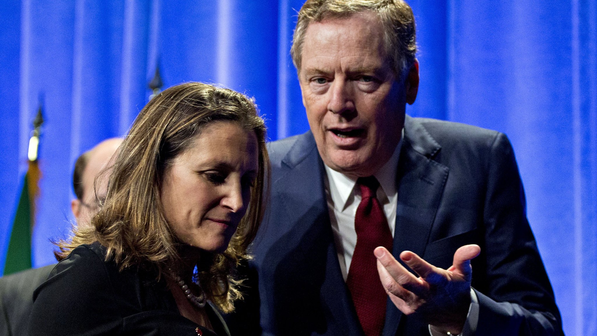 美国贸易代表莱特希泽(右)称,加拿大的做法是对美国贸易救济体系广泛且「不明智的攻击」。图为莱特希泽与加外长弗里兰在之前的谈判中交谈。