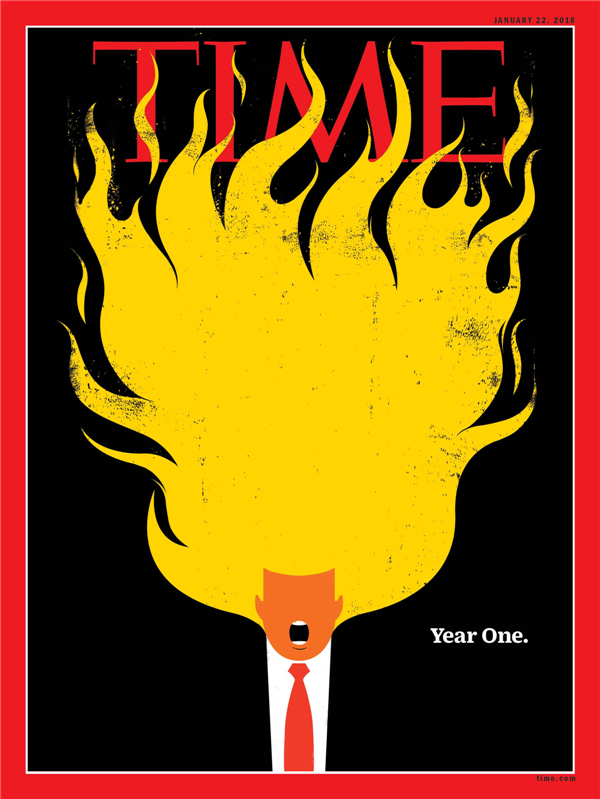 報道稱,封面中的特朗普卡通肖像穿上西裝,黃色頭髮向上飛揚,形成火焰,這把火焰頭髮佔了整個封面約五分之四的高度,標題只有兩個字「Year One」(第一年),諷刺他就任一年響起「多重警報」。