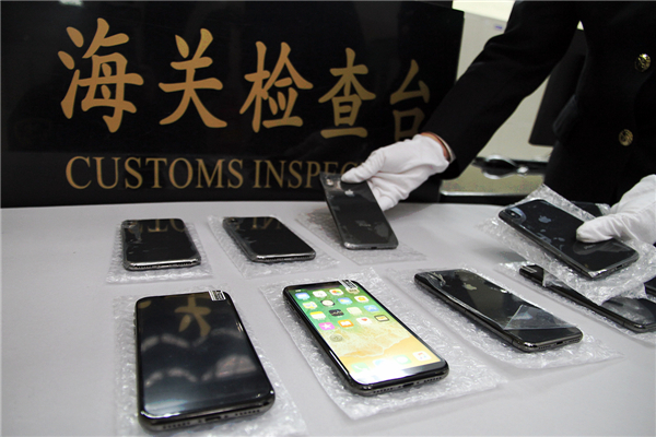 1月7日下午,内地男子章某经无申报通道出境时被截查。关员从章某的行李中发现十余部分别用泡沫袋包裹的黑色手机。机身样式与苹果新款手机iphone X非常相似,背后有明显的苹果手机商标及“IPHONE”字样。但开机后屏幕的细节与iphone X有较明显不同。在关员的查问下,章某承认这些手机都是在深圳购买的“山寨机”。