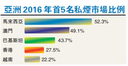研究報告顯示,2016年本港整體香烟消耗量達51億支,其中有14億支是私烟,非法烟草貿易占整體烟草貿易消耗量之27.5%,較2015年同期下降1.6百分點。雖然私烟占整體消耗量的比例相對2012年錄得的35.9%有所下降,但由於非法烟草販賣情况仍然嚴重,導致政府稅收損失估算為每年25億元。
