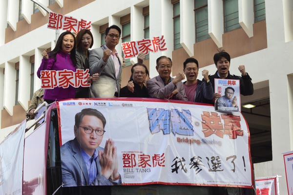 鄧家彪(左三)利用花車展開競選宣傳活動。 記者 馮俊文攝