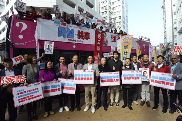 鄧家彪(左六)進行花車巡遊競選宣傳,多名議員及社區領袖到場支持。 記者 馮俊文攝
