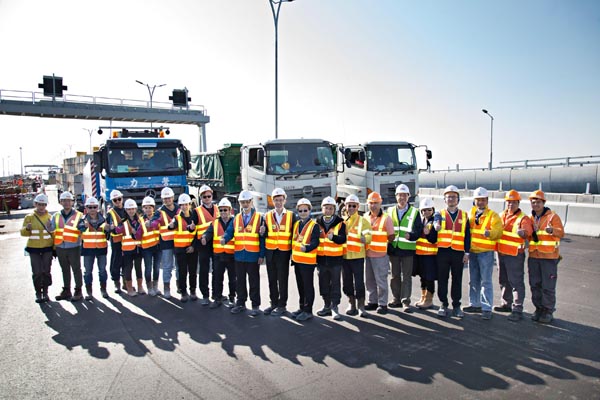 港珠澳大橋香港接線高架橋段最後一座橋跨完成負重荷載測試後,工程團隊及前線人員合照。