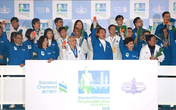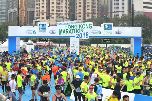 「渣打馬拉松」由行政長官林鄭月娥主持起步禮,參加10公里挑戰賽和半馬的選手,在清晨約5時陸續出發,至於全馬比賽則在約6時10分起步。每年賽事均有不少跑手悉心裝扮,今年亦不例外,除有選手裝扮成日本卡通人物「蛋黃哥」,亦有跑手以鯊魚、恐龍、相撲手等造型示人。