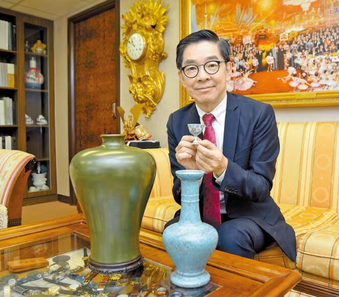 李秀恒除了是政商界知名人士,還是一位熱愛中華文化的文物收藏家。圖中他手持的「酒杯」,其實是一件逾億元的「明成化斗彩花卉紋高足杯」。