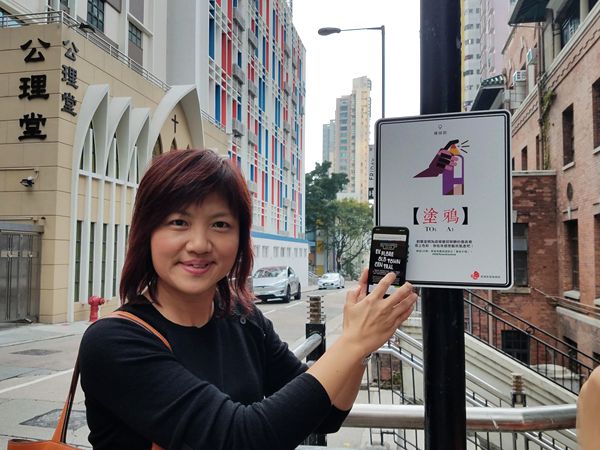 旅發局市場推廣總經理曹天麗示範以手機掃描二維碼開啟「舊城中環」網上地圖。