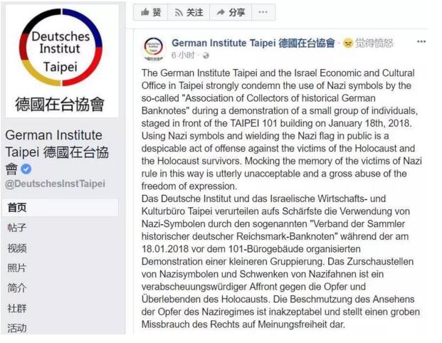 其实,这并不是这个“德国旧马克协会”第一次举纳粹旗上街,“德国在台协会”之前曾对他们的行径发表声明称,多年来“德国旧马克协会”持续不定期联系“德国在台协会”,要求偿付德国1920年代初发行之旧马克币之对等金额,但该纸币早于近100年前即停止流通并丧失价值,这些纸币与一战后德国战后赔偿义务毫无相关,并多次告知,但“德国旧马克协会”仍使用纳粹标志、羞辱方式表达要求,“只可被视为勒索行为”,“我们在此要求德国旧马克协会立刻停止这种冒犯的行为”。