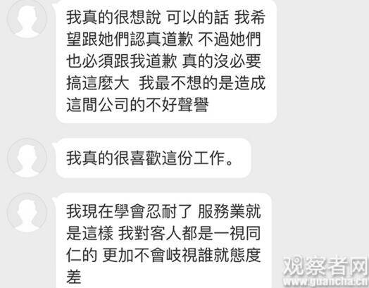男店员表示,“可以的话,我希望跟她们认真道歉,不过她们也必须跟我道歉。真的没必要搞这么大,我最不想的是造成这间公司的不好声誉,我真的很喜欢这份工作。”