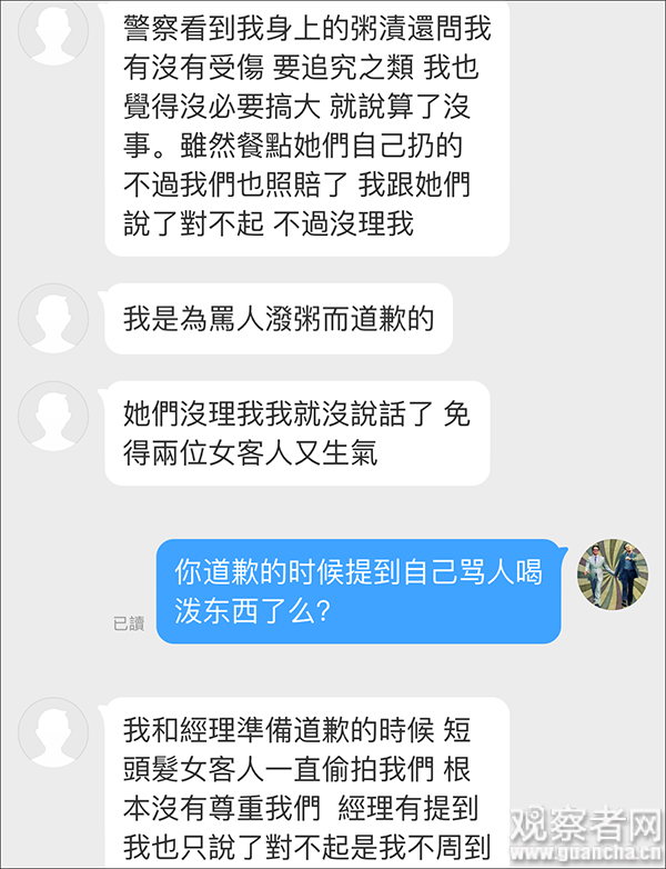 他认为,自己并未泼到女客人,当时她已经走开,“可能是自己弄湿了袖子”。