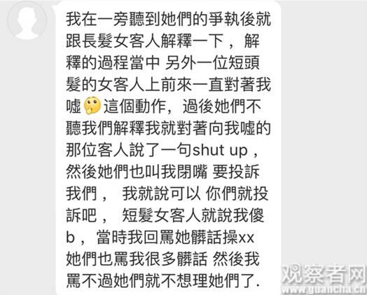 男店员称,他听到双方争执后,试图与其中一位顾客解释。但另一位短发女客人却做“嘘声”的动作,二人都不听解释,之后他便说了句“shut up(闭嘴)”。