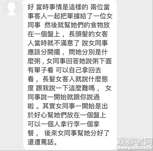 据当事人之一@jojo宜儿的说法,两位内地女生请女服务员分粥但遭到敷衍,随后与之发生口角。但男店员称,女同事帮顾客分好了粥,后来“还遭骂话”。