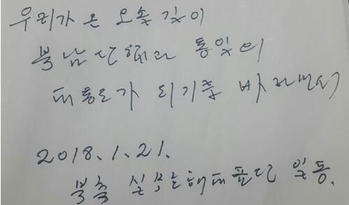 海外网1月23日电 21日,朝鲜三池渊管弦乐团团长玄松月一行前往韩国,为朝鲜艺术团冬奥会期间赴韩演出提前“踩点”。据韩媒报道,当晚朝方人员用过晚餐后,在酒店的留言簿上写了一句话。虽然内容简短,却引发了韩国舆论的猜测。