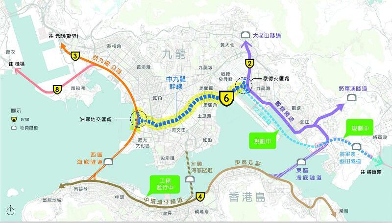 路政署署長鍾錦華在簽約儀式中表示,於九龍灣擬建的海底隧道將采用臨時填海方式建造,以保護維多利亞港的完整,是中九龍干線工程項目中一個最具挑戰的部分。合約工程尚包括在九龍城碼頭公共運輸交匯處對開建造一條約160米長及40米闊的海濱長廊,成為連接海心公園與啟德發展區的海濱長廊的其中一部分。工程不會影響被評為二級歷史建築的九龍城客輪碼頭及九龍城汽車渡輪碼頭。中九龍干線全長4.7公里,采用雙程3線分隔車道的設計,是連接西九龍油麻地交匯處與東九龍啟德發展區和九龍灣道路網的策略性干道,工程預計可於2025年完成并通車,以紓緩中九龍道路網的擠塞情况,預計在繁忙時間來往油麻地與九龍灣的車程將由25分鐘大幅縮短至約5分鐘。整個工程費用超過百億元。