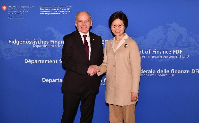当地时间1月23日,行政長官林鄭月娥前往伯恩及巴塞爾,繼續瑞士的訪問行程。圖为林鄭月娥在伯恩與瑞士聯邦委員會副主席、財政部長于利·毛雷爾(左)會面。