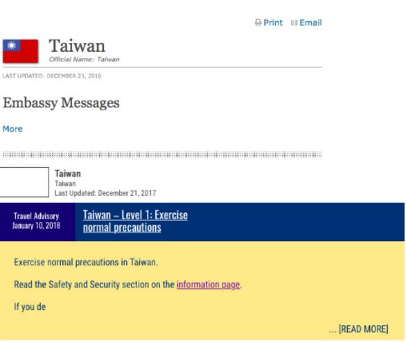 此外,美国国务院领事事务局官网近期改版,在其关于台湾的页面中,“青天白日满地红旗”图案也已消失,目前仅剩一个白色长方形图示。该页面显示最后一次更新为去年12月21日,该网站其他页面同样是2017年12月21日更新,但其他旗帜照常。