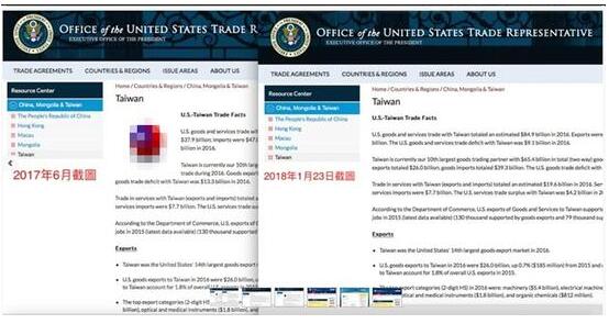 据报道,在美国贸易代表署官网“国家与地区”栏目下,介绍各国或地区与美国的贸易情况,台湾列于“中国大陆、蒙古与台湾”名目下。特朗普政府去年上任后,美国贸易代表署网页曾改版,但去年6月关于台湾的页面上仍有“青天白日满地红旗”图案。而现在台湾页面的“青天白日满地红旗”图示已消失,其他图示照常。