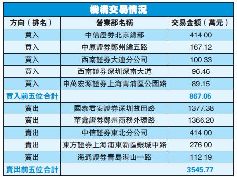 從龍虎榜數據可以看到,中信證券北京總部證券營業部竟買入了414萬元,佔總成交額比例的10.99%。而從整個龍虎榜看,大戶跑得明顯比散戶快。因為,賣出金額最大的前5名佔了總成交比例的94.17%。其中,國泰君安深圳益田路證券營業部和華鑫證券鄭州商務外環路證券營業部分別賣出1377.39萬元和1366.20萬元,這兩家營業部賣出額,就佔總成交量的72.86%。
