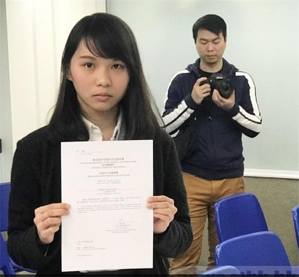 昨日,周庭在记者会上展示选举主任裁定其参选提名无效通知信。