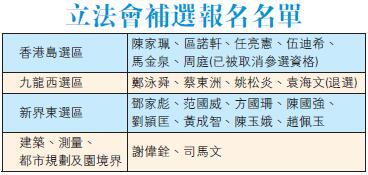 立法會4個議席將於3月11日舉行補選,提名期在昨日結束,當中以新界東選區接獲最多報名表,包括工聯會鄧家彪、新民主同盟范國威、沙田區議員陳國強、西貢區議員方國珊、社區網絡聯盟劉颖匡、前立法會議員黃成智、報稱獨立的陳玉娥及趙佩玉,總共8人。