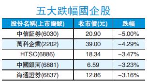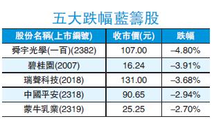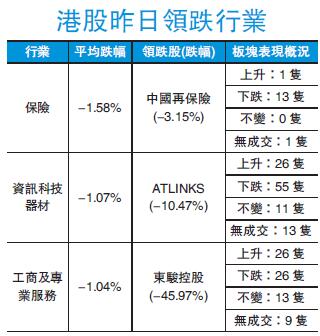 強勢保險股領跌,中國平安(2318)跌近3%險守90元;友邦保險(1299)跌1.8%,合共拖低恒指91點。中國財險(2328)跌2.9%;中國人壽(2628)、中國人保(1339)、中國太保(2061)及新華保險(1336)跌2.1%至2.7%。