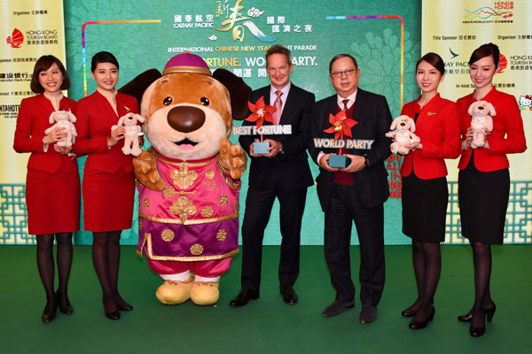旅發局主席林建岳(右三)與香港國泰航空公司行政總裁何杲(中)預祝2018國泰航空新春國際匯演成功。