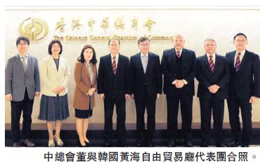 【香港商報网訊】韓國中華總商會會長宋國平日前帶同韓國黃海自由貿易廳代表團一行5人到訪香港中華總商會。他向中總會長蔡冠深、對外事務委員會主席陳光明、副主席高敏堅、葉少明介紹韓國黃海自由貿易區的發展計劃及探討未來合作的機會。