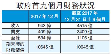 【香港商報网訊】特區政府昨日公布截至去年12月31日本財政年度首9個月的財務狀况,錄得1106億元盈餘。期內,整體開支為3409億,收入為4515億;財政儲備在2017年12月31日為10645億。政府發言人表示,截至12月份的盈餘主要來自地價收入、利得稅和印花稅,本財政年度的修訂預算會在2018年2月28日與《2018至2019年度財政預算案》同時公布。