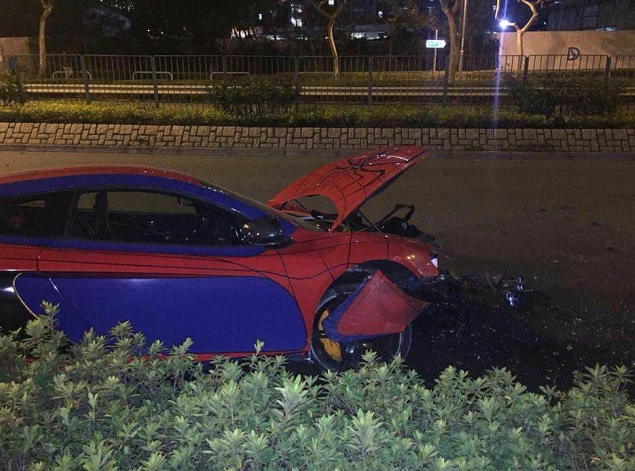 噴上蜘蛛俠花紋的麥拿倫跑車,駛至將軍澳時失事撞毀,肇事司機不知所終。 網上圖片