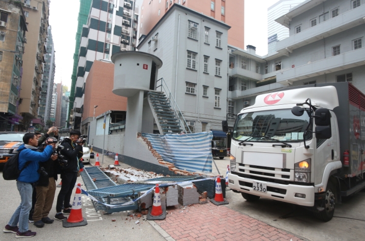 一輛中型貨車(圖右方)駛經舊灣仔警署後門時,失事撞毀警署一幅圍牆及鐵閘。