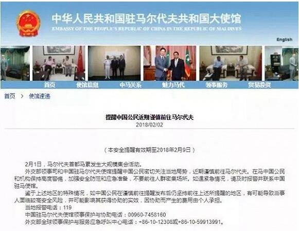 2月2日,中国驻马尔代夫大使馆发布安全提醒,指出鉴于马累1日发生大规模集会活动,中国公民近期应谨慎前往马尔代夫。大使馆建议,在马中国公民和机构应保持高度警惕,加强安全防范和应急准备,不要前往人群密集场所。如遇紧急情况,应及时报警并联系使馆。