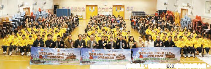 香港百人學生「一帶一路」研習交流團(七)小學生陝西之旅啟動禮上,賓主與逾200學生及家長合照。