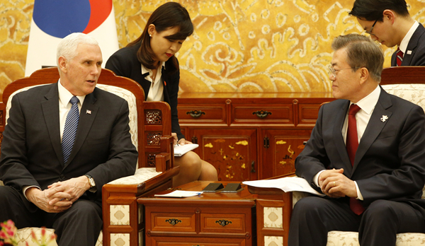 韓國總統文在寅昨天在青瓦台接見來訪的美國副總統彭斯。 路透社