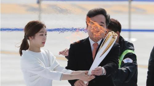 资料图:韩国总理李洛渊(右)、平昌冬奥宣传大使金妍儿(左)手持圣火。