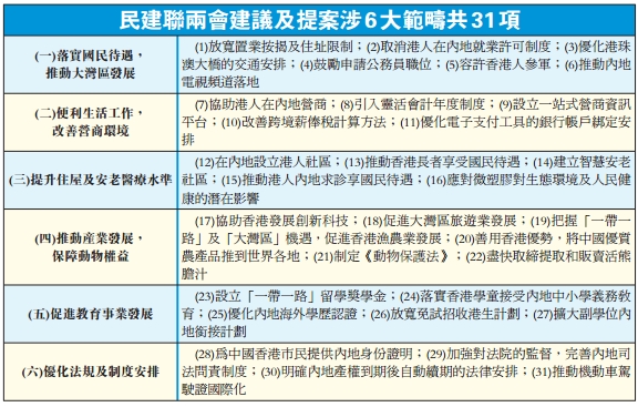 民建聯表示,今年兩會將共提出31項人大建議及政協提案,包含6個方面。第一方面是「落實國民待遇,推動大灣區發展」,當中有6項建議。