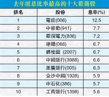 以2017年數據統計,藍籌當中,以電能(006)息率12.5%最高,該公司派2016年末期息2.02元,連同中期股息及特別息,全年股息合計7.72元。如只計末期息,每手電能獲派1010元,全年的話更達3860元。藍籌中去年以碧桂園(2007)股價升幅最為標青,股價大升2.4倍,而工行(1398)亦升近50%,兩者派息比率同為藍籌中慷慨之選,息率高之餘,又能捕捉到股價增長,絕對是財息兼收之選。