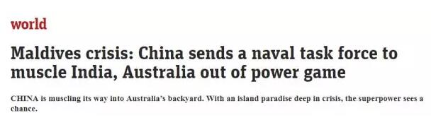 澳大利亚新闻网的报道标题则是这样的:马尔代夫闹危机,中国派了支军舰编队向印度秀肌肉,澳大利亚出局……