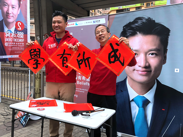 【香港商報网訊】記者葉佩瑜報道:距離立法會補選尚餘兩星期,參選九龍西補選的民建聯鄭泳舜昨午請來前立法會主席曾鈺成在街頭即席揮毫,書寫大字與市民賀年。曾鈺成分別以「學、有、所、成」4字贈予鄭泳舜,點出其各項民生政綱,又稱赞他一直出心出力於地區工作,祝願他馬到功成,成功晉身立法會。