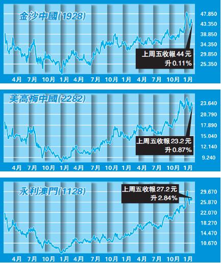 【香港商报网讯】農曆新年為澳門博彩業旺季,加上澳門1月份博彩收入高速增長、訪澳旅客持續回升,加上有新賭場開業,濠賭板塊可望「丁財兩旺」,值博率高,投資者可留意永利澳門(1128)、金沙中國(1928)及美高梅中國(2282)。香港商報記者 勞佩欣